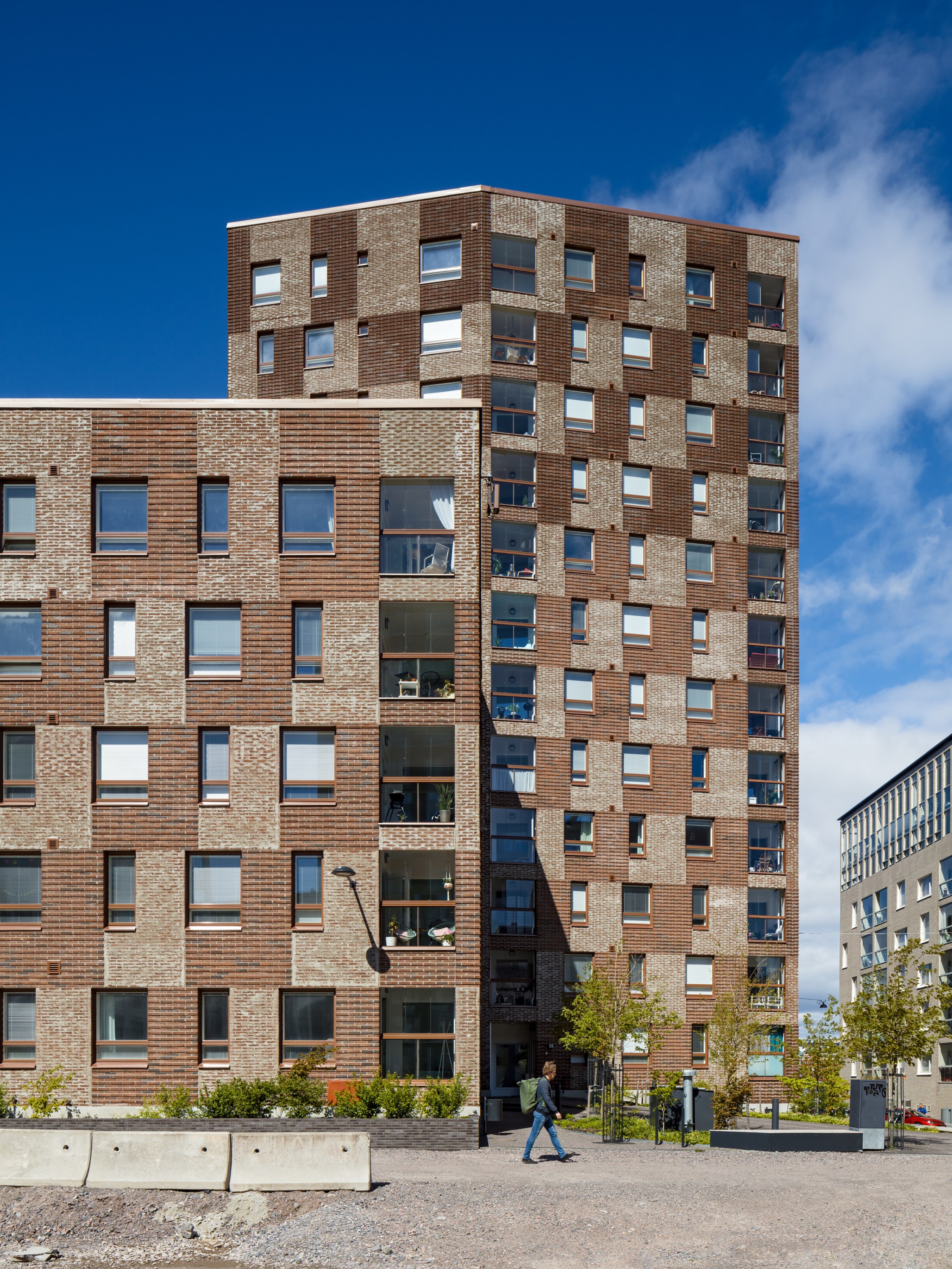 The building has a distinctive but subdued sculptural appearance in the landscape. From a close distance, the details related to the masonry technology of the facades are revealed – variable overlapping, texture and slight difference in depth between different brick surfaces. The thickness of the building body enable apartment floors that are opened in two, even three directions. The tower part of the building has two parallel exit stairs in the same vertical shaft.