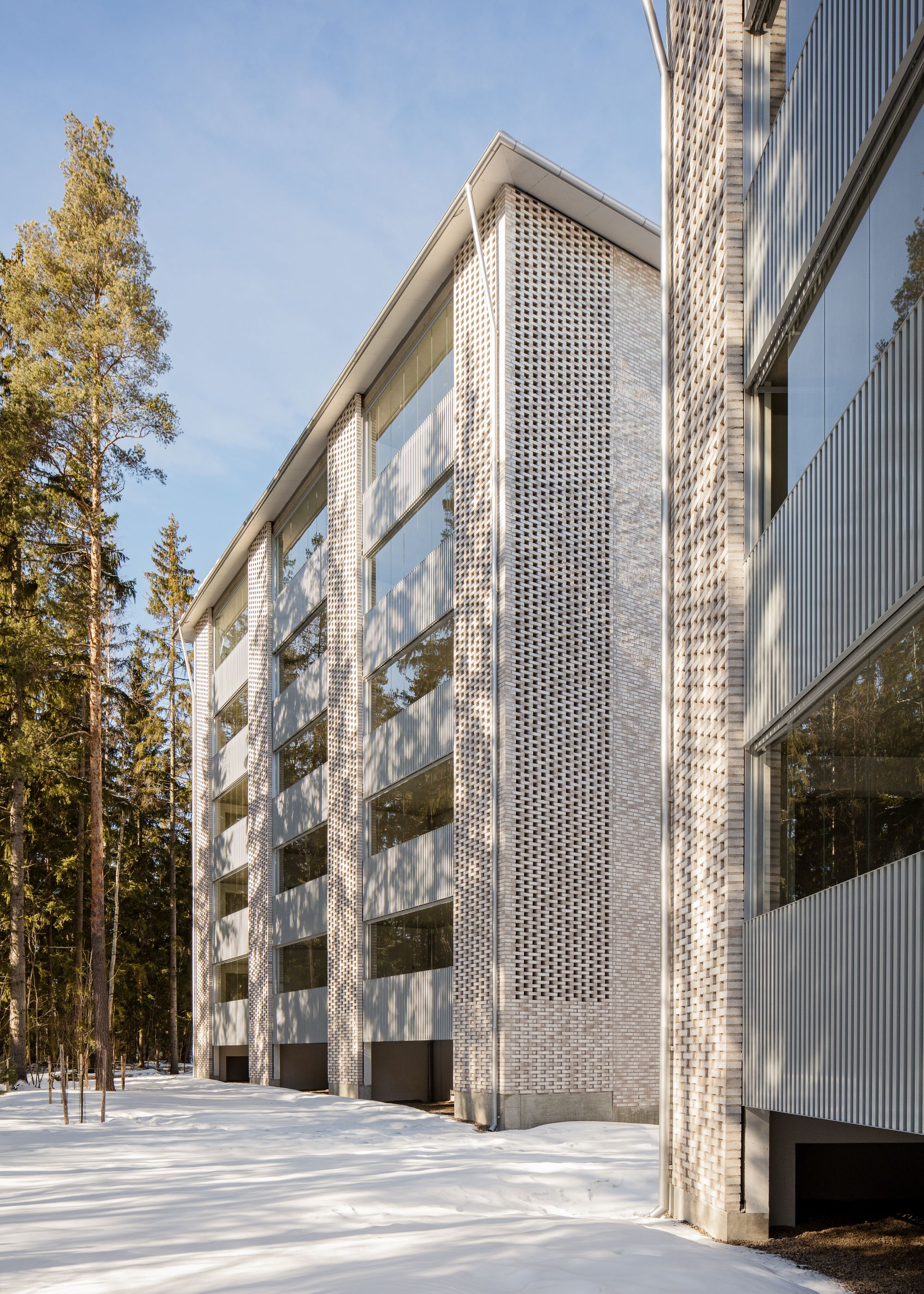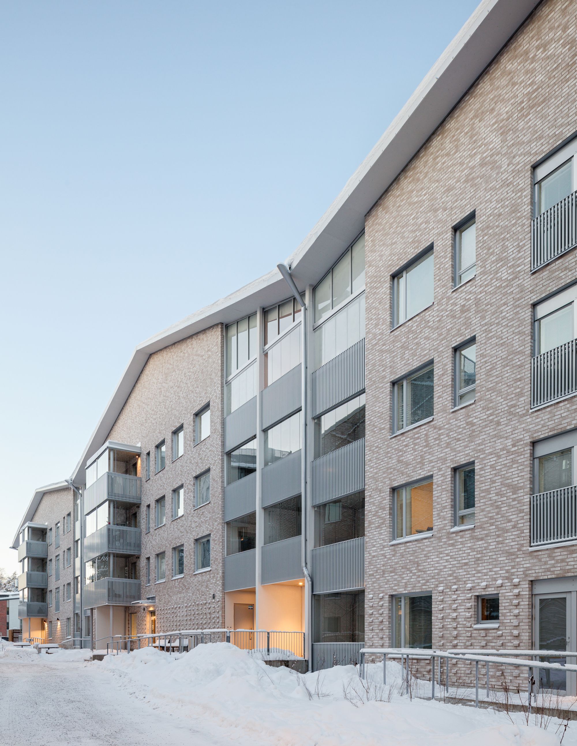 The housing block consists of a three-tiered terraced house and three detached houses in the Kaarela district of Helsinki, on the western edge of Central Park. The complex includes 127 city rental apartments with shared facilities.