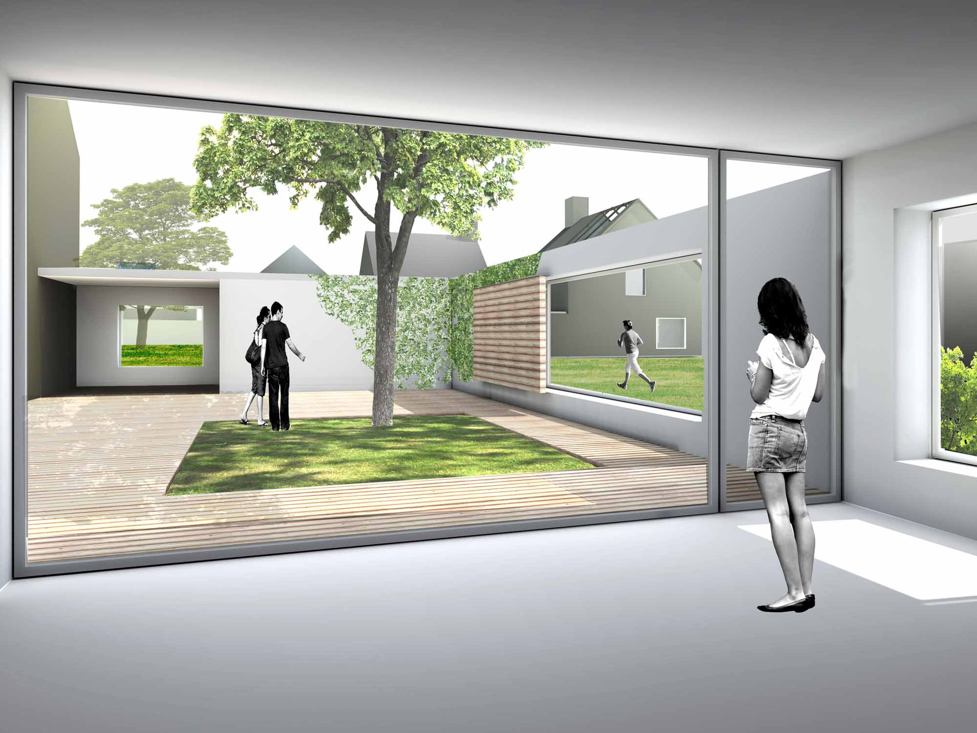 The 1st prize in the international Europan design competition led to a commission to create a preliminary study for a detailed plan. The task was to design a compact low-rise residential area that follows the principles of sustainable development and particularly addresses the needs of young families, focusing on community living.