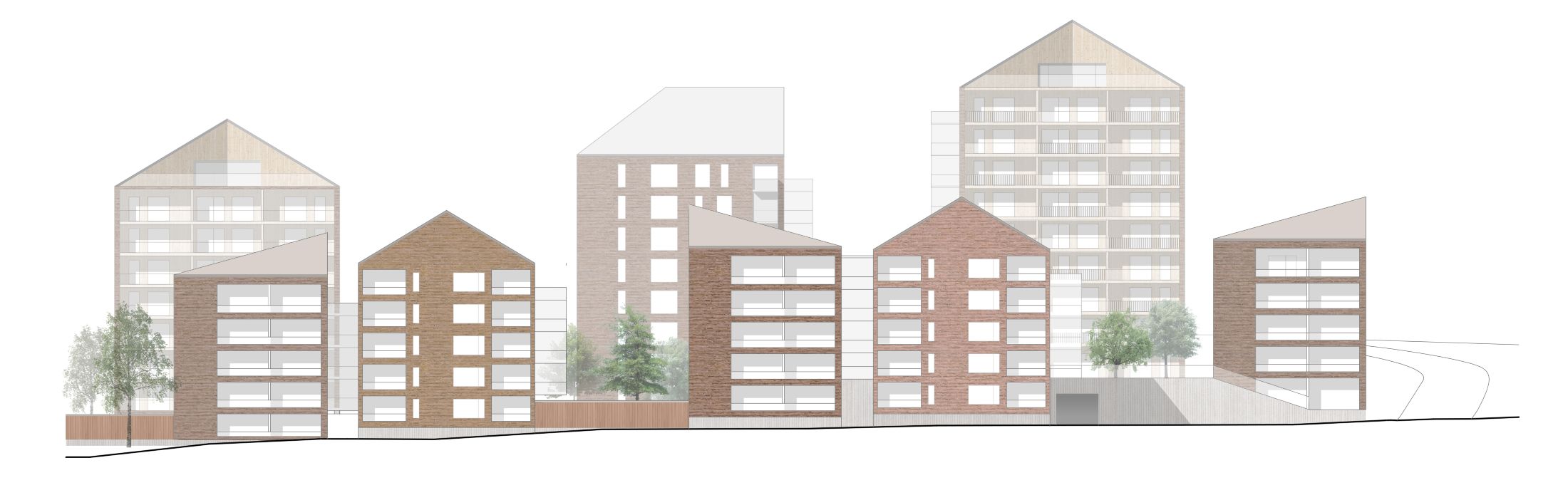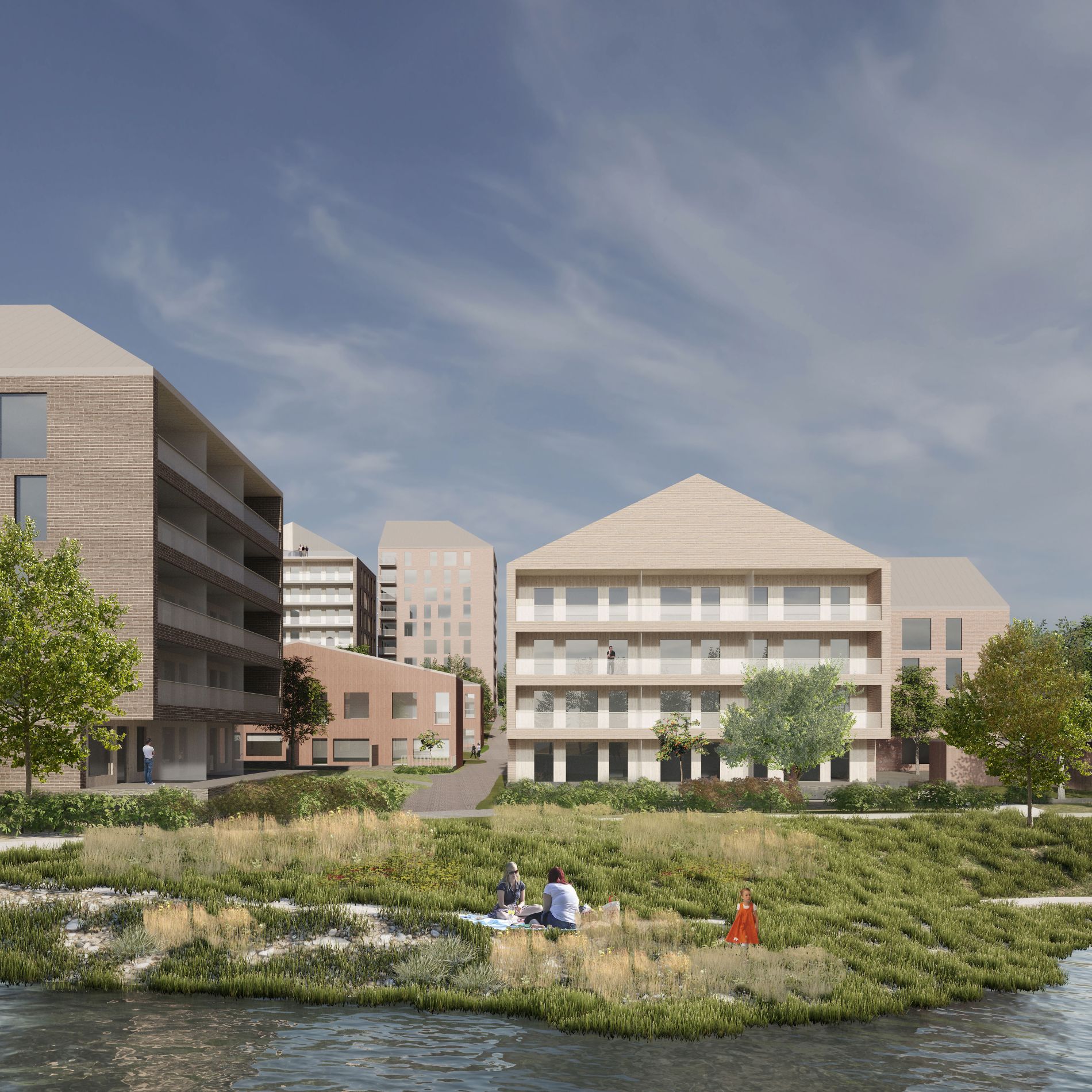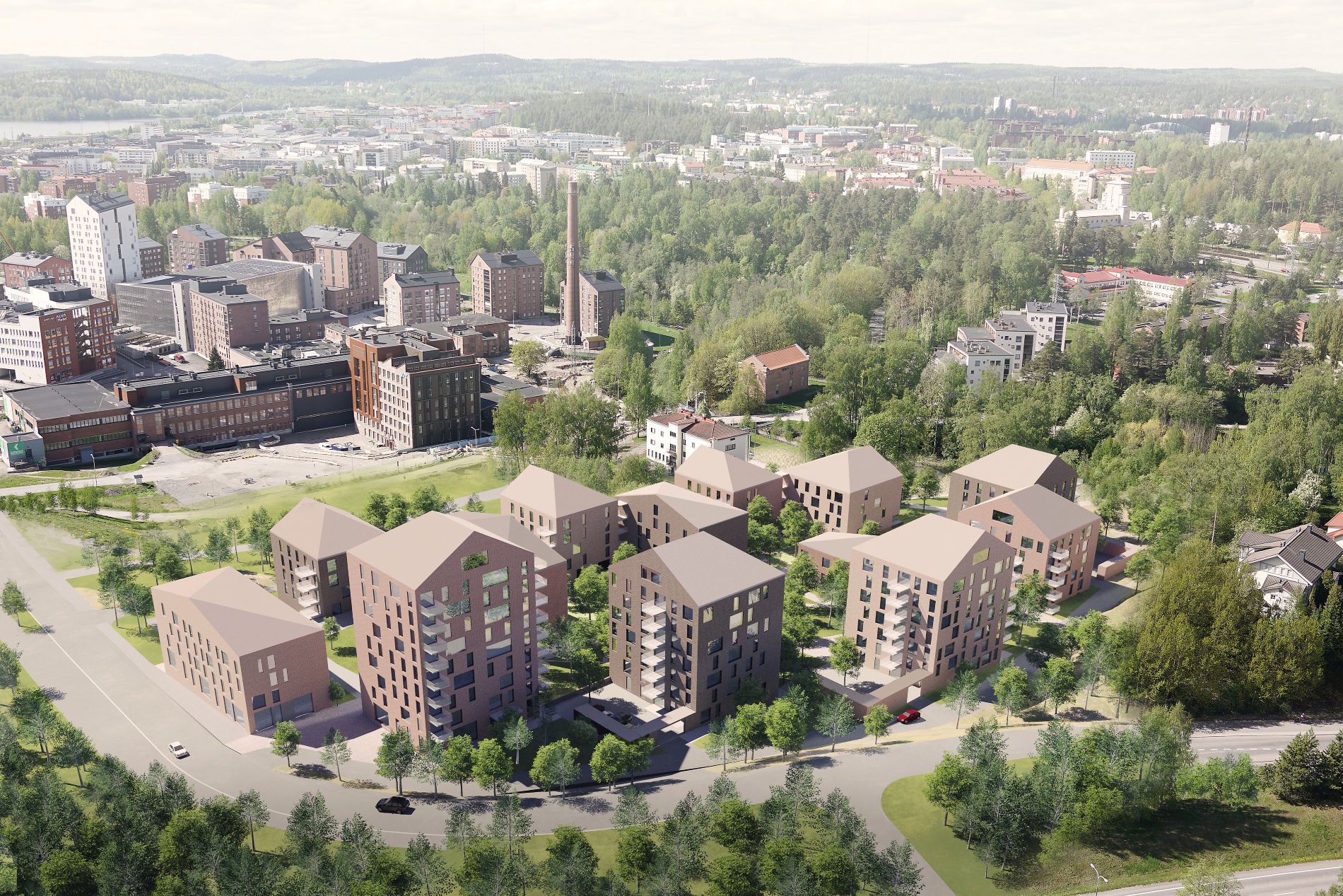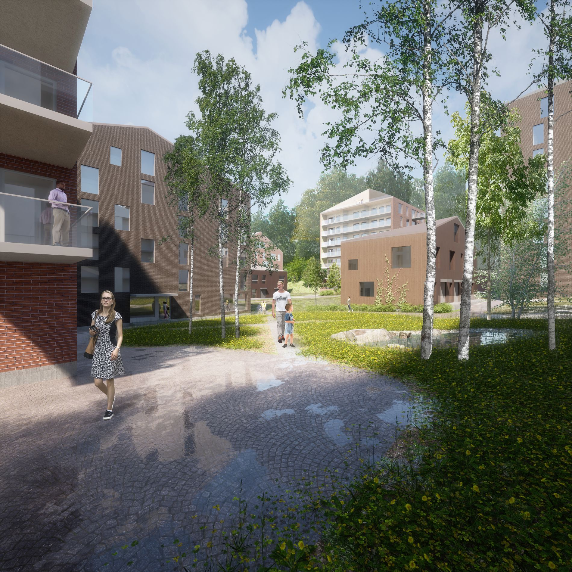 - Kulmittain toistensa lähelle sijoitettujen rakennusten muodostama puoliavoin tilarakenne tarjoaa pitkiä ja monipuolisia näkymiä jokaisesta asunnosta myös alueen sisällä. Ulkotilat liittyvät toisiinsa suureksi saumattomaksi ja vapaasti kuljettavaksi kokonaisuudeksi. Samalla ne kuitenkin tuottavat myös kodikkaita pihapiirejä ja pieniä naapurustoja: eletään yhdessä erikseen.