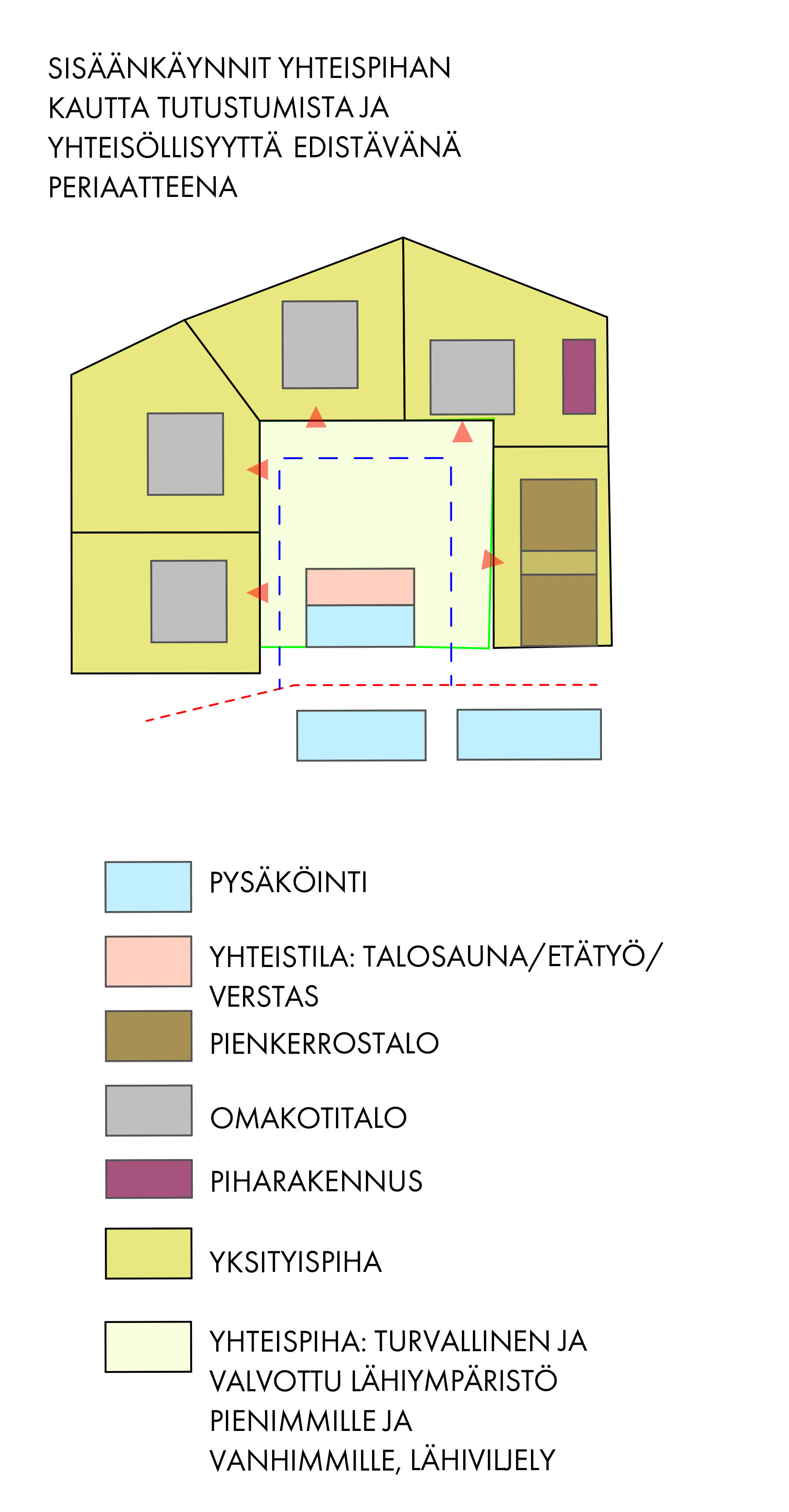 - Otimme haasteeksi erityisesti asumisen yhteisöllisyyden kehittämisen alueella, joka on nykyään hyvin yksityistä ja pientaloasumiseen painottunutta. Kehitimme korttelityypin, jossa erilaiset talotyypit mahdollistavat monipuolisia asumisen mahdollisuuksia. Omatonttisten talojen väliin jäävät yhteispihat toimivat asukkaita yhdistävinä puolijulkisina kohtaamispaikkoina. Suunnitelman laativat Arkkitehtitoimisto Sami Vikström Oy ja Maisema-arkkitehtuuritoimisto Aino Landscaping Oy.