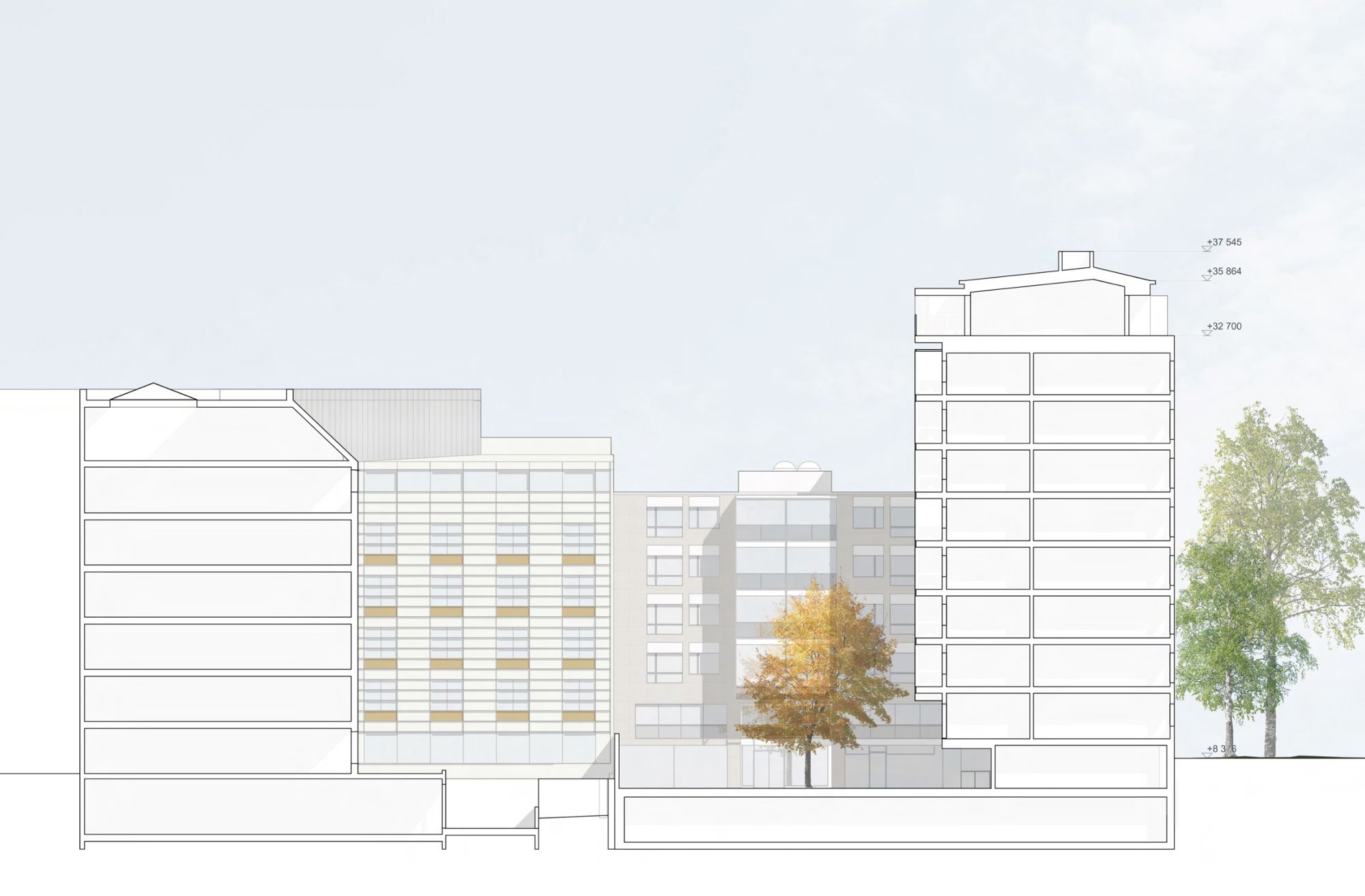 - Suunnitelmassa pohdittiin koko taloyhtiön kellareiden ja kerrosten tilajärjestelyjä uudelleen. Lisäksi tutkittiin sisäpihan lisärakentamisen potentiaalia ja pihajärjestelyjä.
