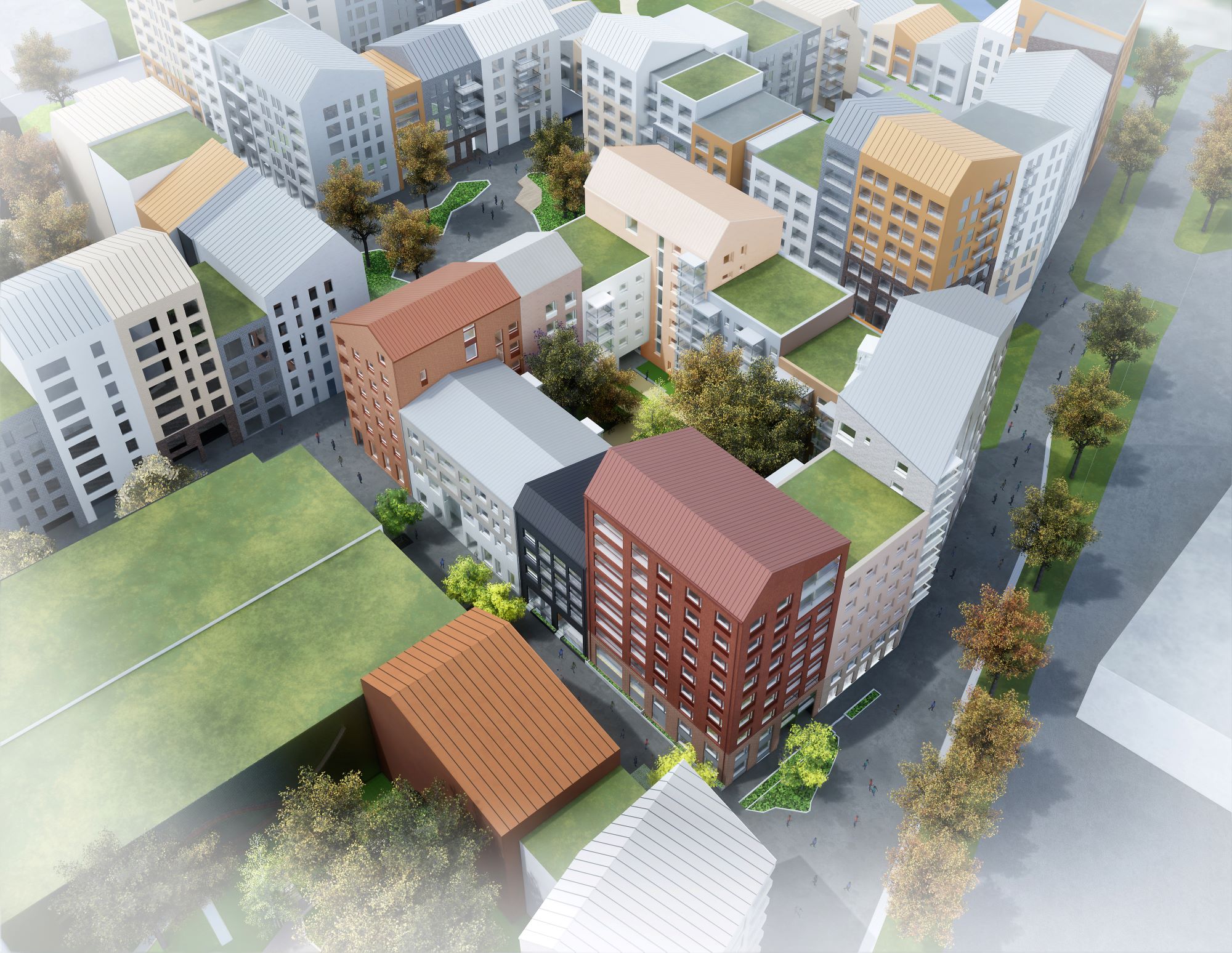 This housing block in Annefred area of Aviapolis consists of four apartment building plots that enclose a green, shared inner courtyard.