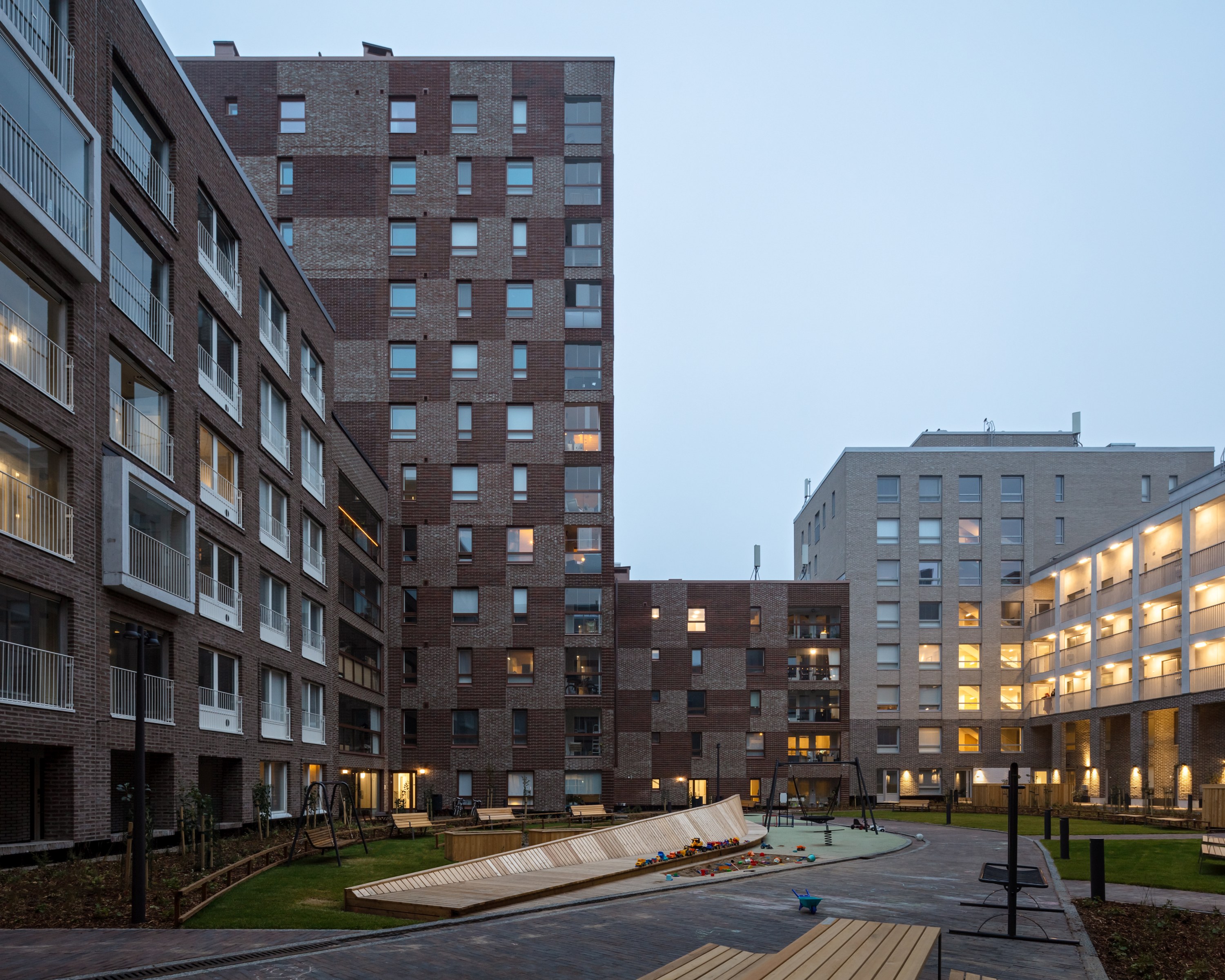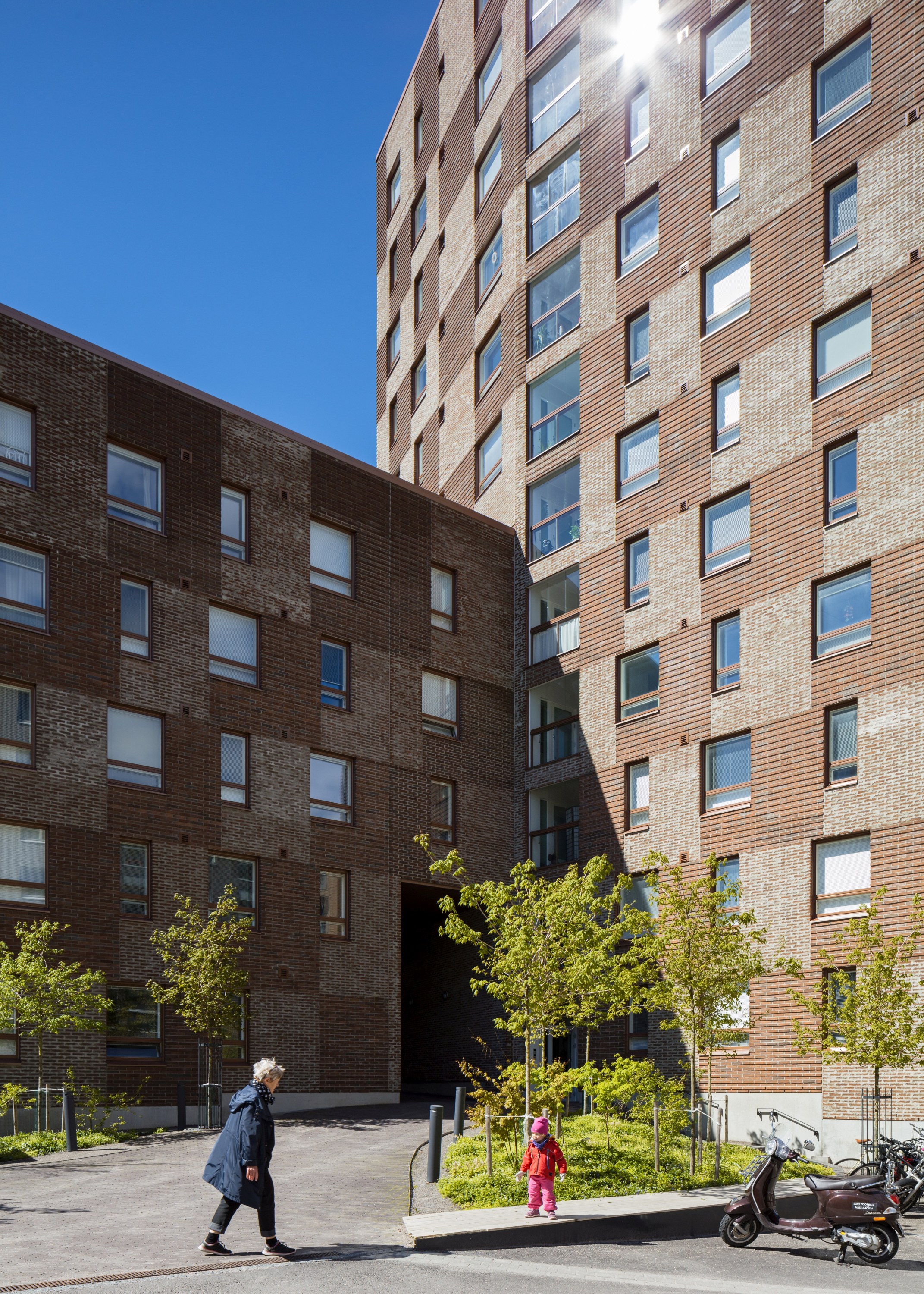 The building has a distinctive but subdued sculptural appearance in the landscape. From a close distance, the details related to the masonry technology of the facades are revealed – variable overlapping, texture and slight difference in depth between different brick surfaces. The thickness of the building body enable apartment floors that are opened in two, even three directions. The tower part of the building has two parallel exit stairs in the same vertical shaft.